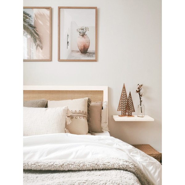 Decore o seu quarto com este pacote composto por uma cabeceira de madeira natural e tecido de ráfia com duas mesinhas de cabeceira a condizer.