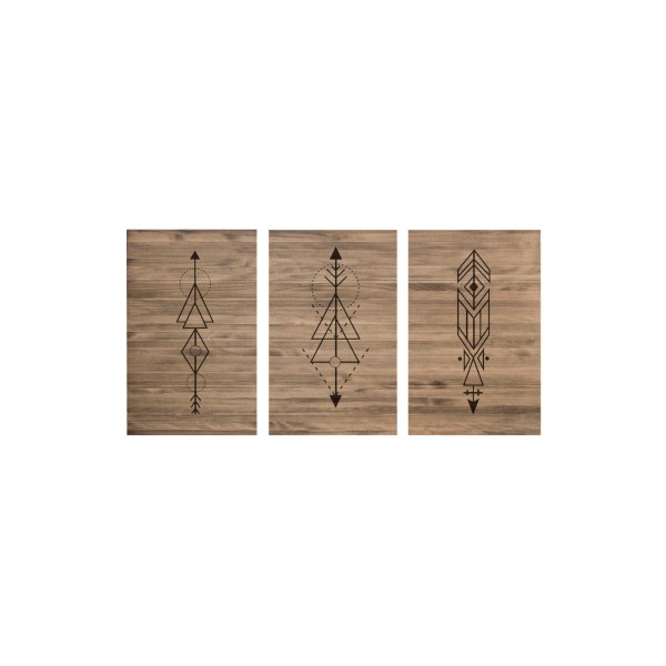 Cabeceira de madeira galega em tríptico de pinho com acabamento envelhecido artesanal na Espanha impressa com flechas geométricas.