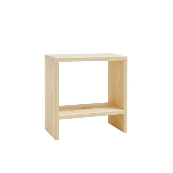 Mesa de cabeceira ou auxiliar com acabamento natural. Sua estrutura é formada por ripas de pinheiros de flancos.